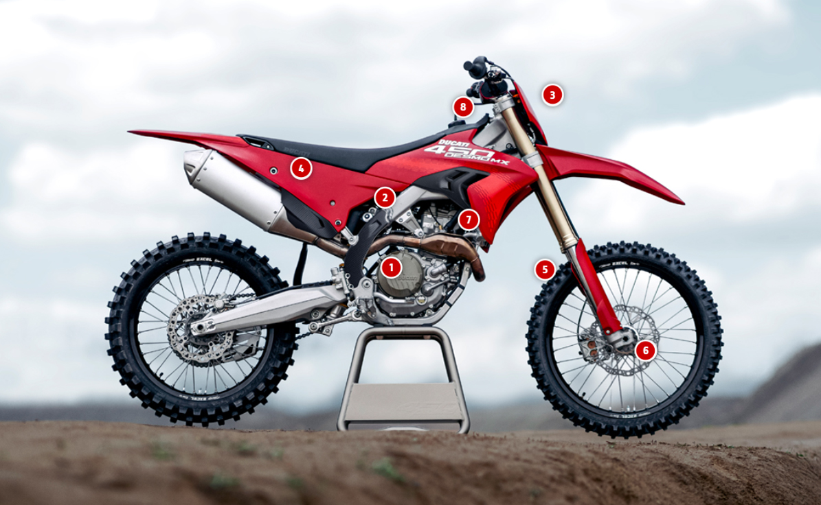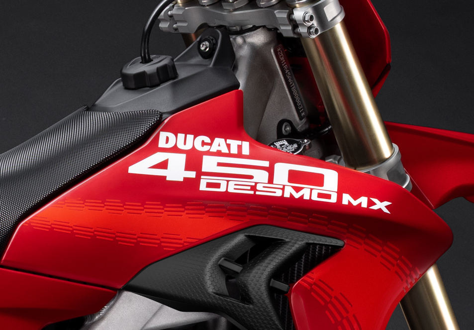 Γεννημένη για να αγωνίζεται, αναπτυγμένη στην πίστα. Η Desmo450 MX είναι η πρώτη motocross μοτοσυκλέτα της Ducati με σύστημα desmodromic, σχεδιασμένη για να μεταφέρει το αγωνιστικό DNA του Borgo Panigale εκτός δρόμου. Ελαφριά και ισχυρή, συνδυάζει προηγμένη τεχνολογία και μέγιστες επιδόσεις, προσφέροντας ταχύτητα, έλεγχο και καθαρή αδρεναλίνη.